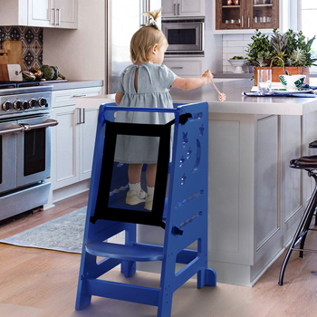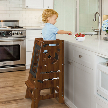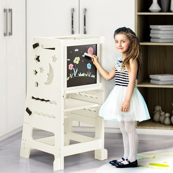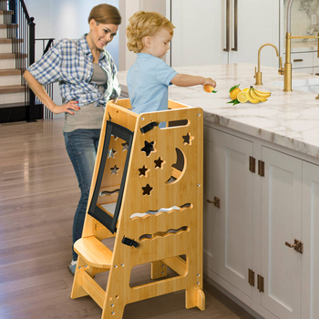 4-in-1 Toddler Kitchen Step Stool, Foldable Learning Standing Tower with Blackboard, Bamboo Kitchen Stool Helper for Kids